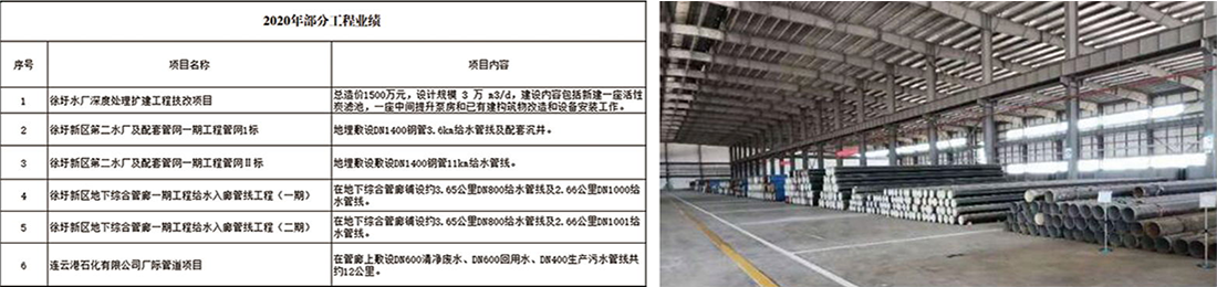 公司在管道施工、检测、运维等方面有着巨大优势。一是公司仓库库存材料齐全、成本较低、应急物资与设备充足。二是工程管理人员经验丰富,目前,公司所参与的管线工程涉及钢管、球墨铸铁管、 PE管、双壁波纹管、PPR 管、PVC管、玻璃钢管、混凝土管等多种管材;涉及工法有沉管、拖管、拱管、挂桥等;钢管最大口径DN1400;2020年工程承接额约4亿元。b