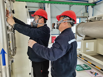 东港污水厂维保班组正确佩戴安全帽、防毒面具及检查手套对臭氧发生器管道进行巡检